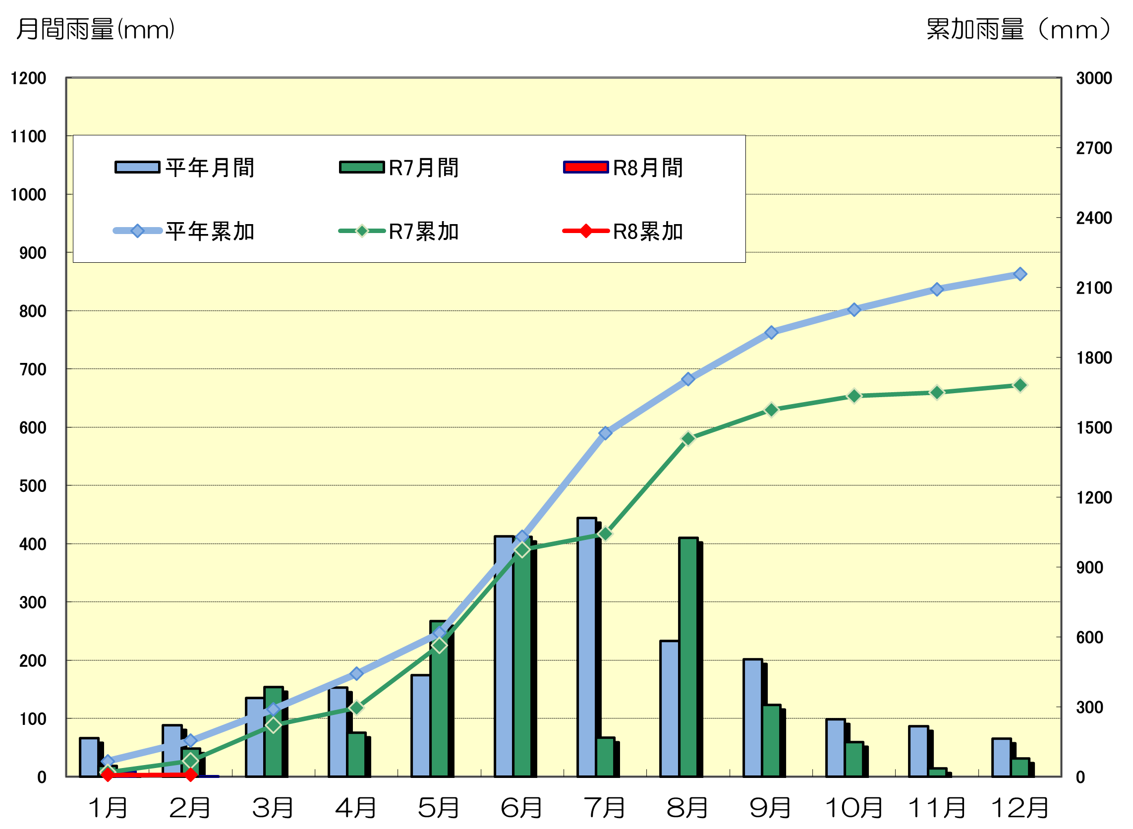 | R7月間雨量 | 18.1 | 48.6 | 154.0 | 75.2 | 266.6 | 412.0 | 66.7 | 409.6 | 123.5 | 59.3 | 14.5 | 31.3 |