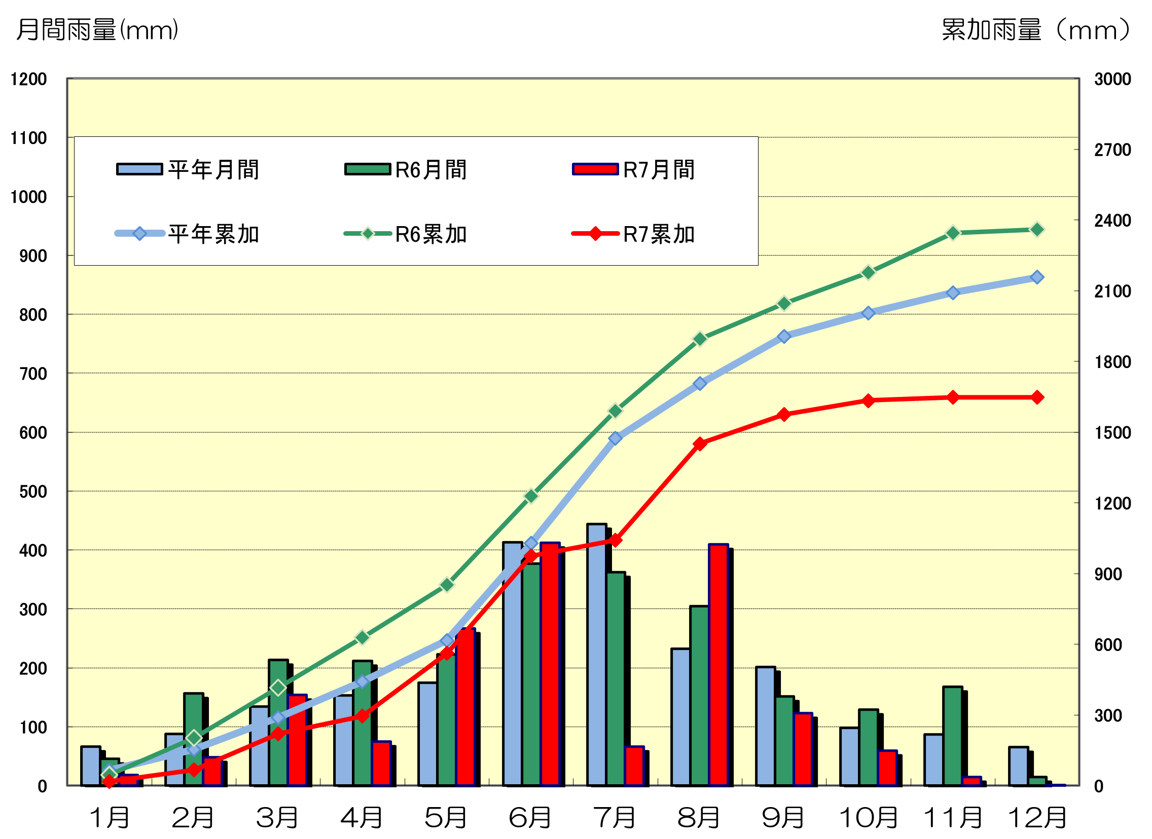 | R6月間雨量 | 46.1 | 156.6 | 213.4 | 212.0 | 223.2 | 376.7 | 362.3 | 304.5 | 151.6 | 129.2 | 168.2 | 14.6 |
