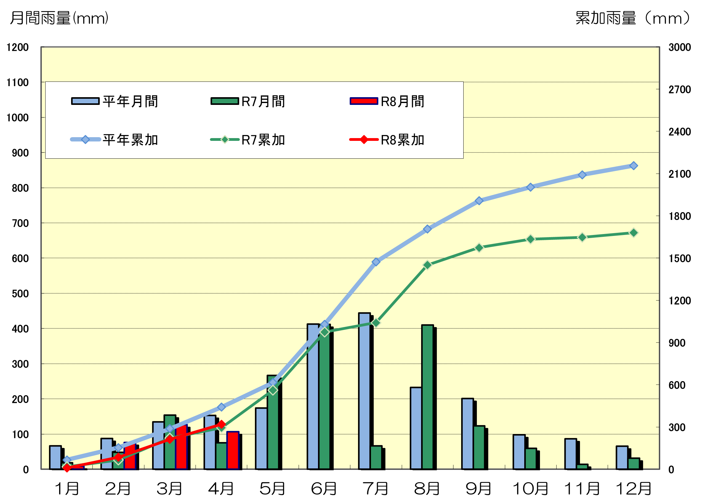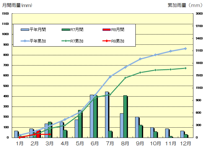 | R7月間雨量 | 18.1 | 48.6 | 154.0 | 75.2 | 266.6 | 412.0 | 66.7 | 409.6 | 123.5 | 59.3 | 14.5 | 31.3 |