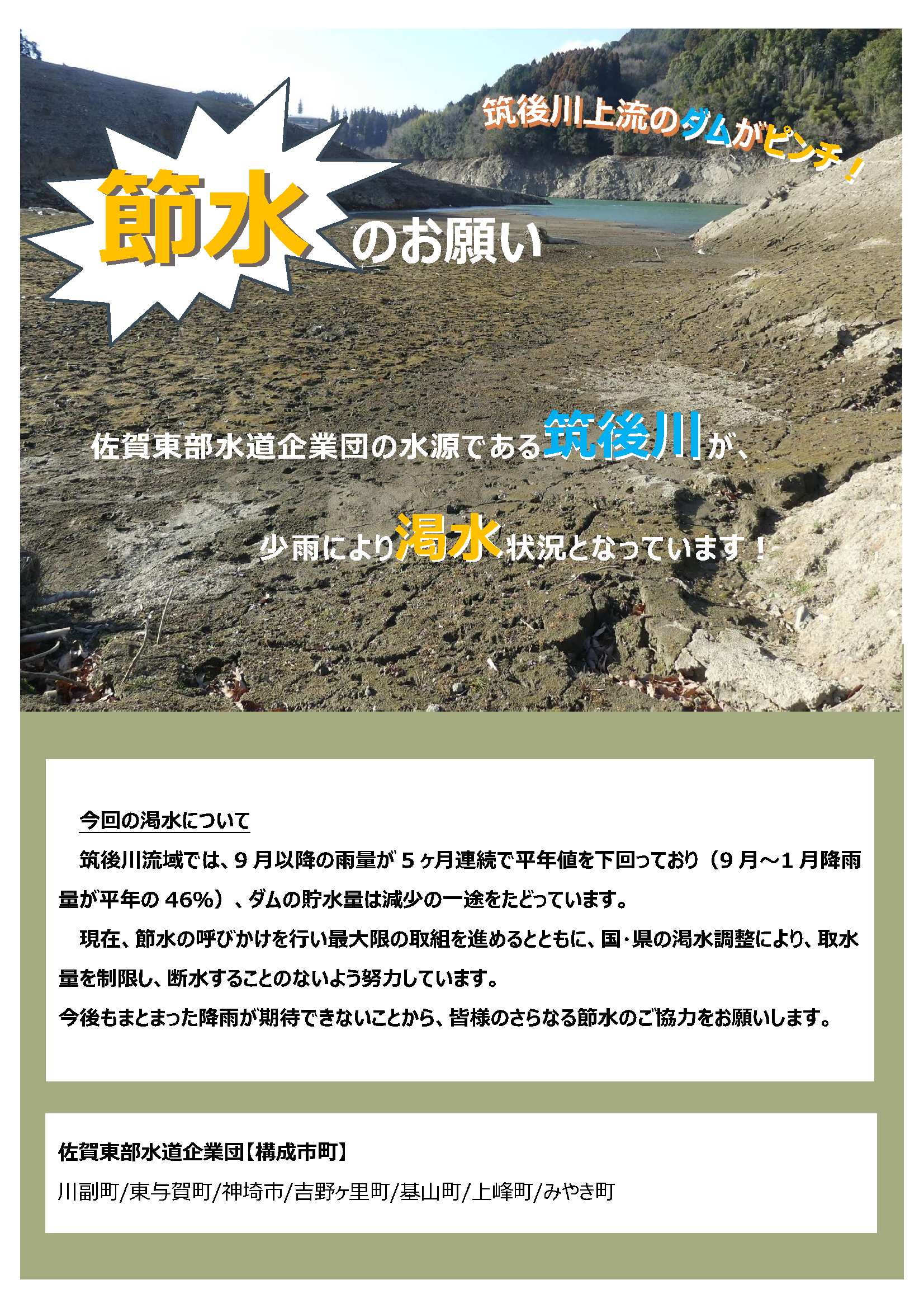 9月以降の少雨により、企業団の水源である筑後川が渇水状況となっています。企業団としても、取水制限を行うなど最大限の努力をしておりますが、今後もまとまった降雨が期待できないことから、皆様ひとりひとりのご協力をお願いします。